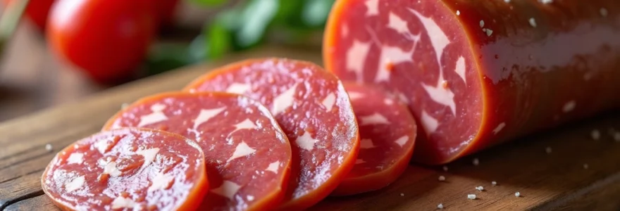 Les salamis halal présentent une texture ferme et homogène résultant d’un processus de maturation contrôlé. Isla Délice , leader du marché français avec 40% de parts de marché, développe ses salamis avec une densité moyenne de 0,85 à 0,90 g/cm³. Cette densité permet une découpe nette sans effritement, essentielle pour obtenir des tranches généreuses de 3 à 5 millimètres d’épaisseur.